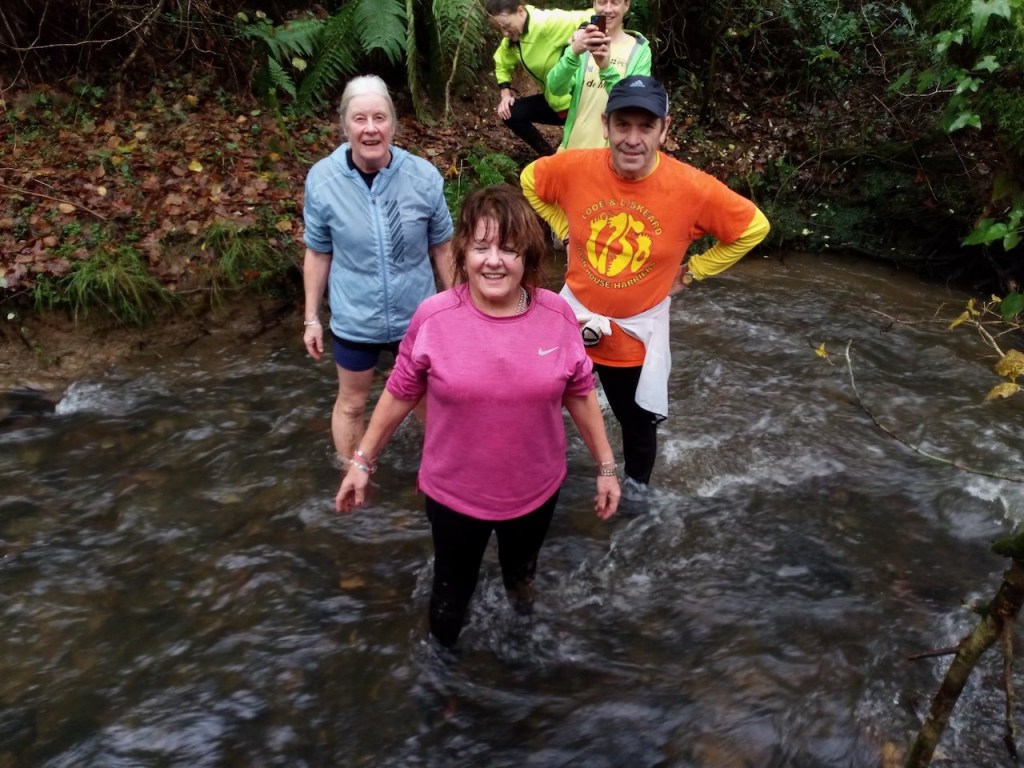 Fortunately Carnage saved the day and found the trail which went up high through the woods. I got up the front with Forrest and there became a battle of calls between Forrest who knew she was on the right trail and Hornby who thought he was but kept coming across falses and wasn’t!!! It was pretty much Rambo terrain and my head got caught on a couple of branches. I thought I might need hash bandage but I was OK. Eventually we were all following the correct trail, across the river, up the path, more Rambo stuff and the final bit up a lane, through a farm, across a field and a path back to the car park. It was a great run so thanks go to the hares. The best thing about being carried is that I don’t get muddy!!!