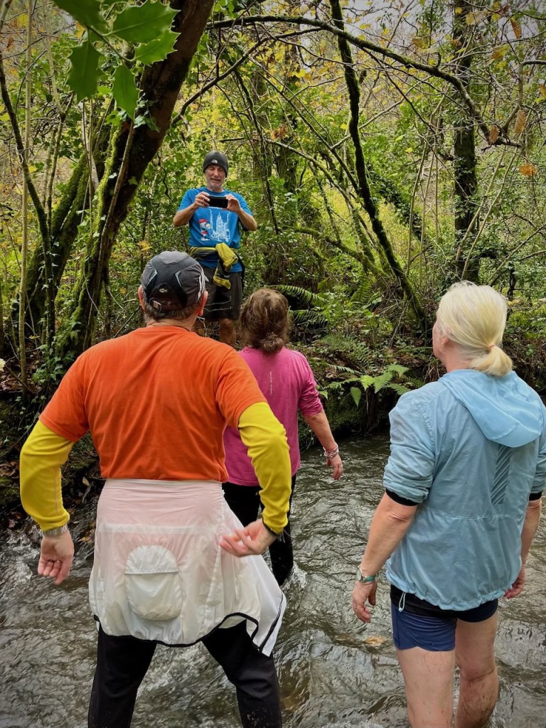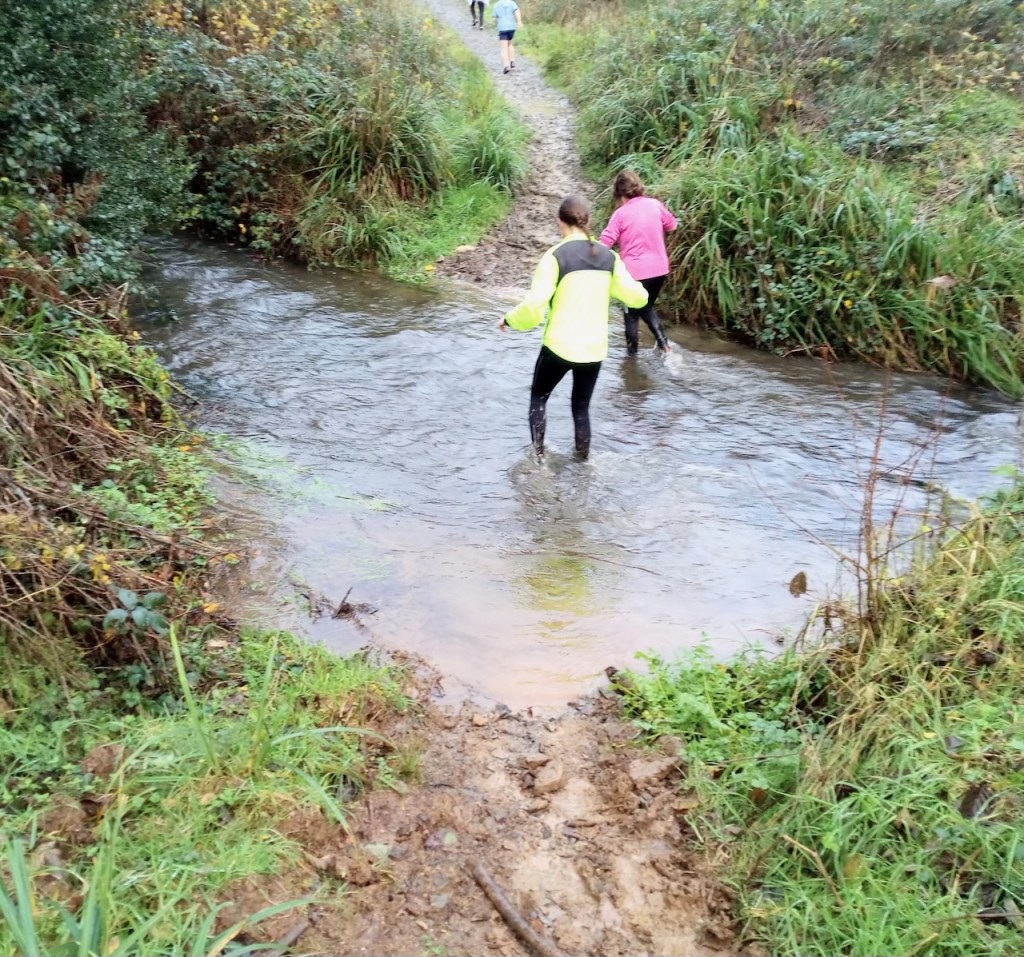 At the first river crossing, most of the hashers opted to cross over the false, but at the second one, most decided to ‘go for it’! The On Sec decided to opt not to, and NOT because she had new shoes, but because her trainers are gortex which keeps the water out if raining or shallow puddles but not when crossing a deep stream and once the water is in- the gortex doesnt let it out again !!! So Forest along with Scarlet Moggie, Hot Bottom, Kiss me Kate and Wingeing Pom skipped over the false and continued on the hash, not seeing anyone again until the pub!!! I don’t think anyone drowned- they all seemed to be at the on down. Great run on what I think was new territory, lots of ups and downs, twists and turns and MUD.