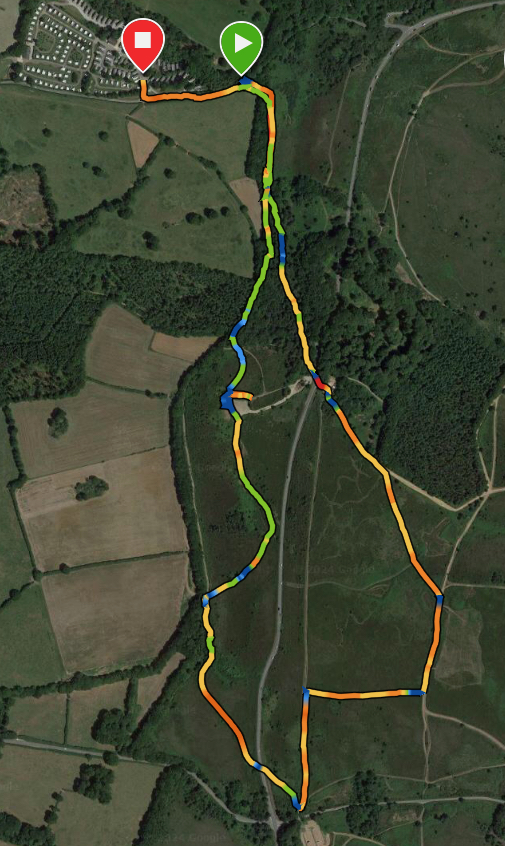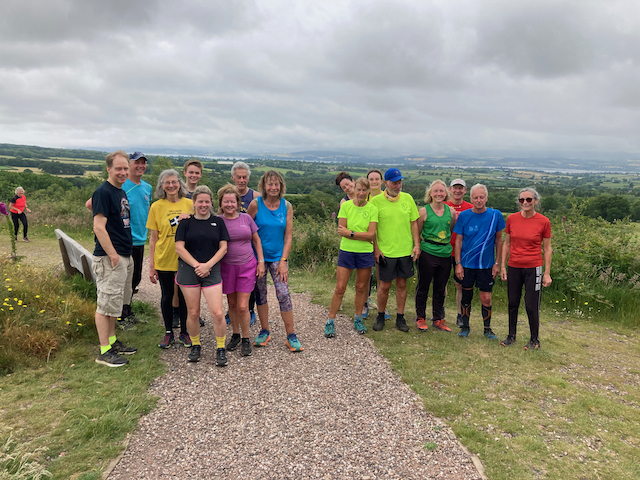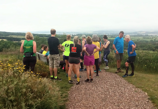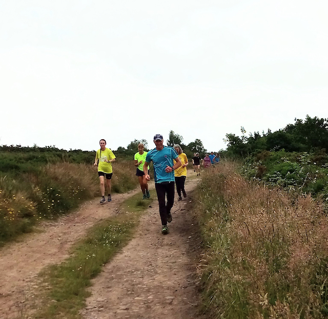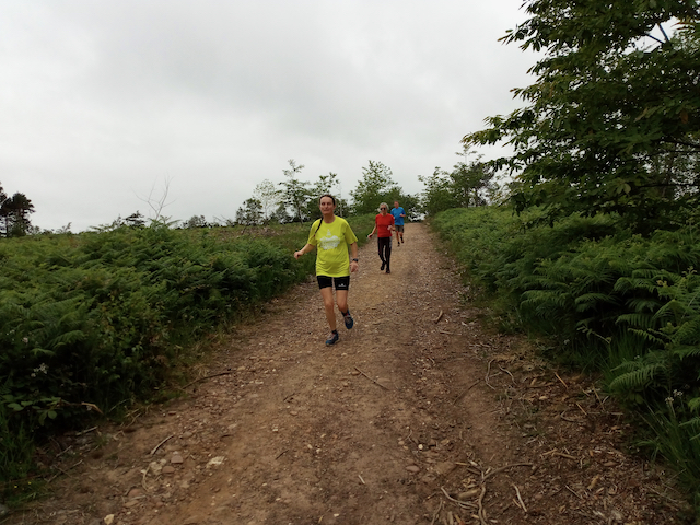 Sundays run was hared by Potbelly and Withanee starting at a bridleway up the road from the campsite, briefing no gates, sawdust and treasure stop. The run took us down the wooded bridleway to the hill fort, though the wood to the common and on tracks to and around a plantation and a long climb to a viewpoint overlooking the Exe estuary where the treasure was placed before returning on bridleways to the campsite.