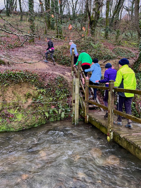 Godmother hared the shorts and Biscuits the longs. Three long short splits and a treasure stop where the reason for the diversion could be seen, a bridge overtopped by the river. Shoes and boots were lost in the mud before we ascended back to high ground and the route back to the farm.