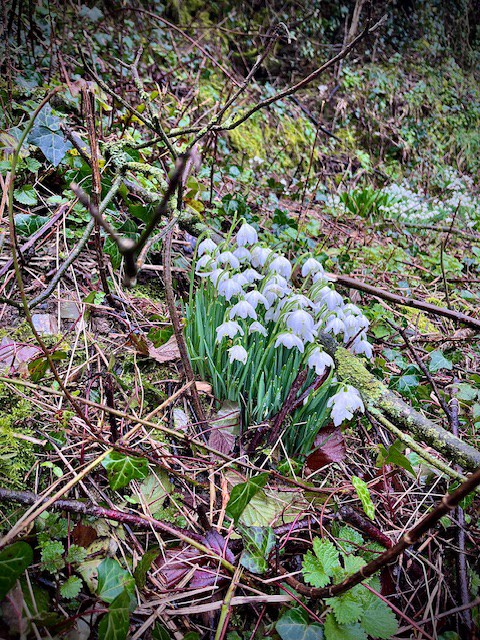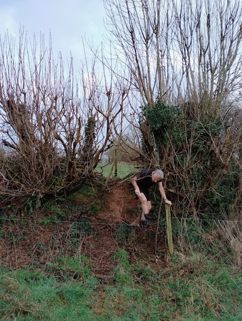 The long was quite Rambo in places with low, barbed wire fences and low branches to navigate, all whilst trying to keep your footing on the slippery mud on a steep bank. Think Hornby is forgetting how old some of us Hashers are! Luckily the longs had Pedigree Chum to do a lot of the checking. Lovely to see signs of spring breaking through: catkins and snowdrops everywhere. There was also a lot of wild garlic starting to peep through the sodden soil.