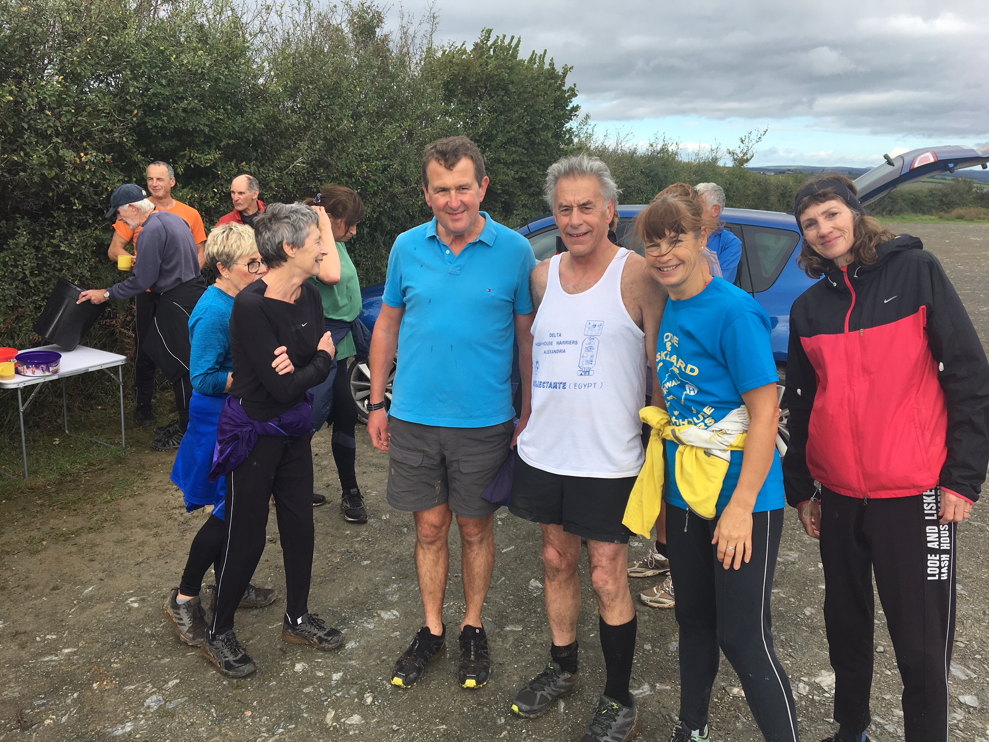 Hash from Tremadart Farm Duloe. 27 Hashers including Hares set off in fine weather across fields with very little in the way of stock. The shorts were out longer than the longs due to a miss-read false. After returning to the cars and not finding any shorts or a treasure stop some of the dedicated long runners retraced their steps and found the second long short. Back at the On Down Hornby read out a reminder of what Hashing was all about. Curing hangovers, physical health and reminding older members they’re not as old as they seem. Down Downs were given for the Hares Whingeing Pom and Bronyon. A second Down Down for Bronyon for 100 times as Hare. Endosperm for misreading a false and Horse Trough for getting lost in the maize. A great Hash and good beer.