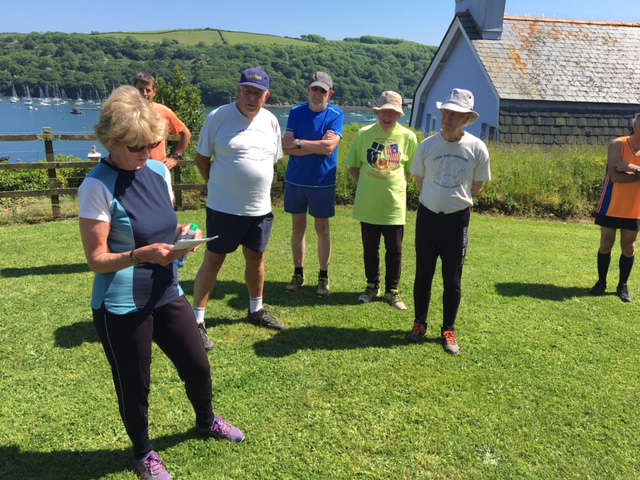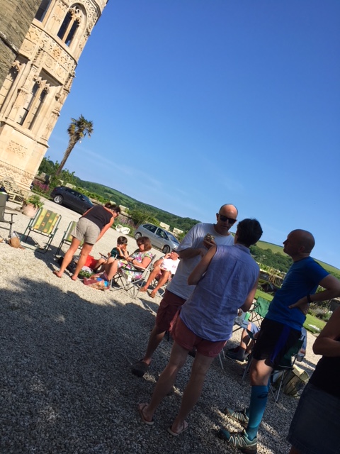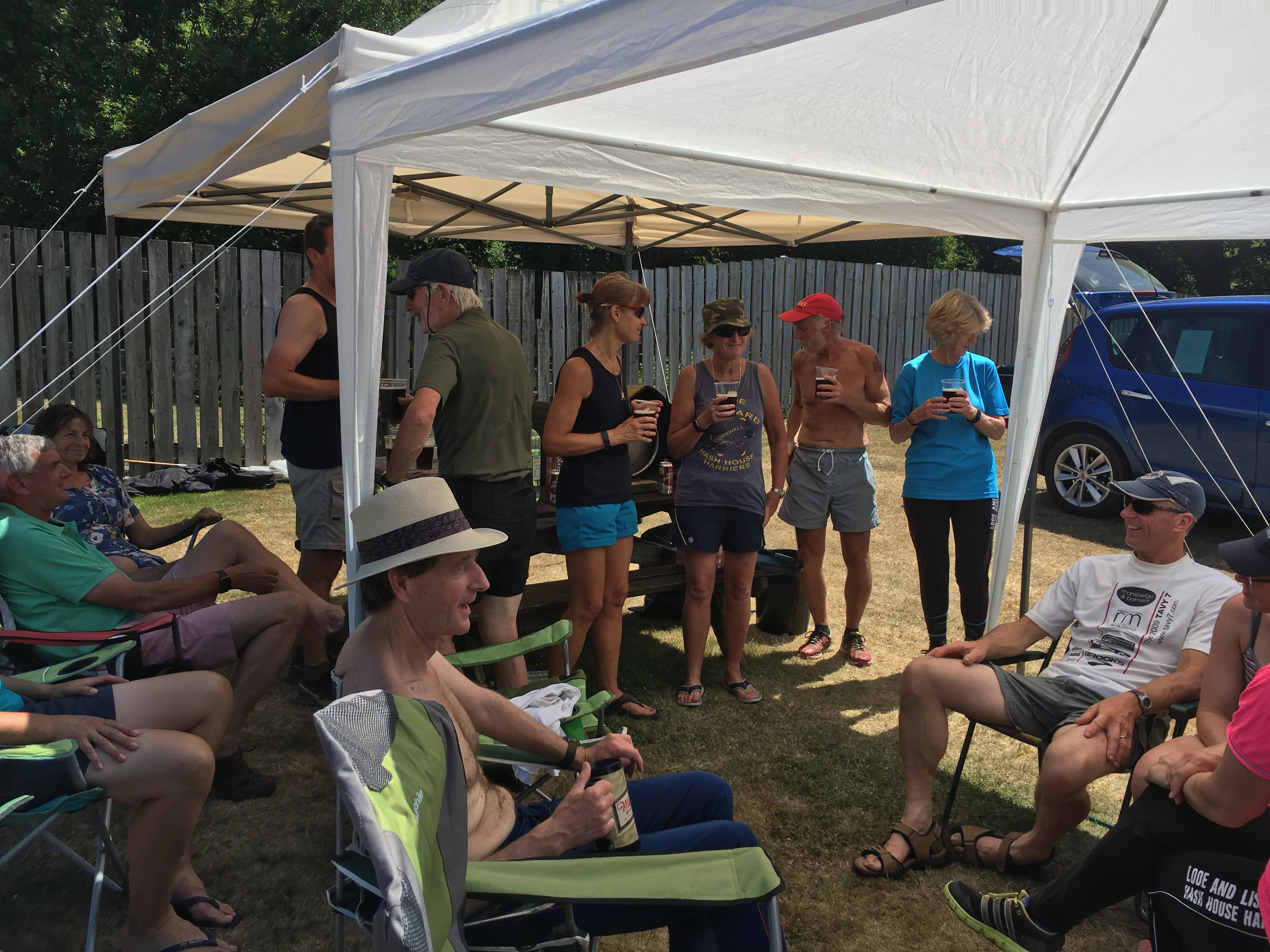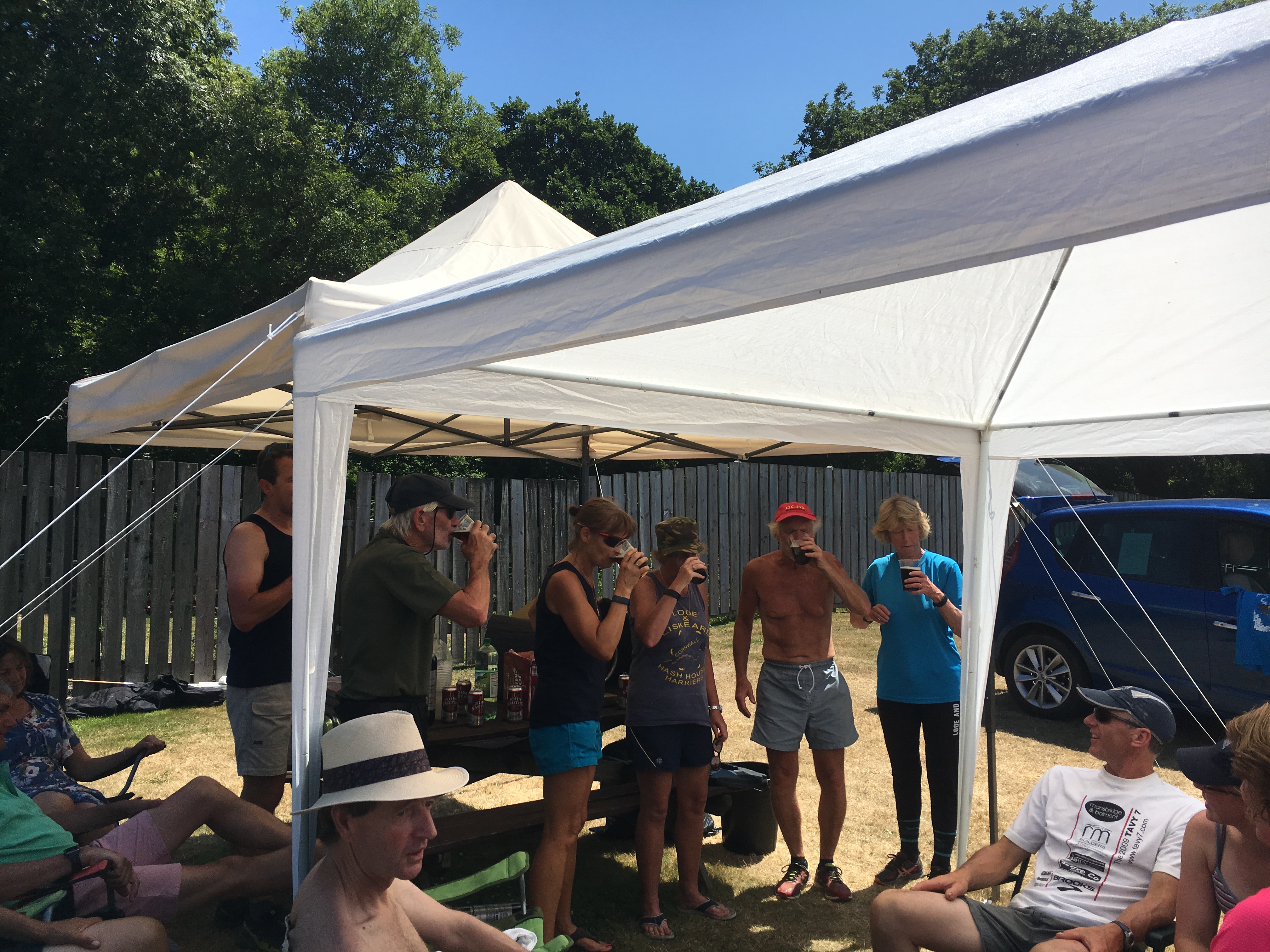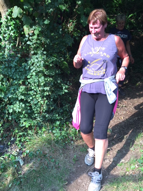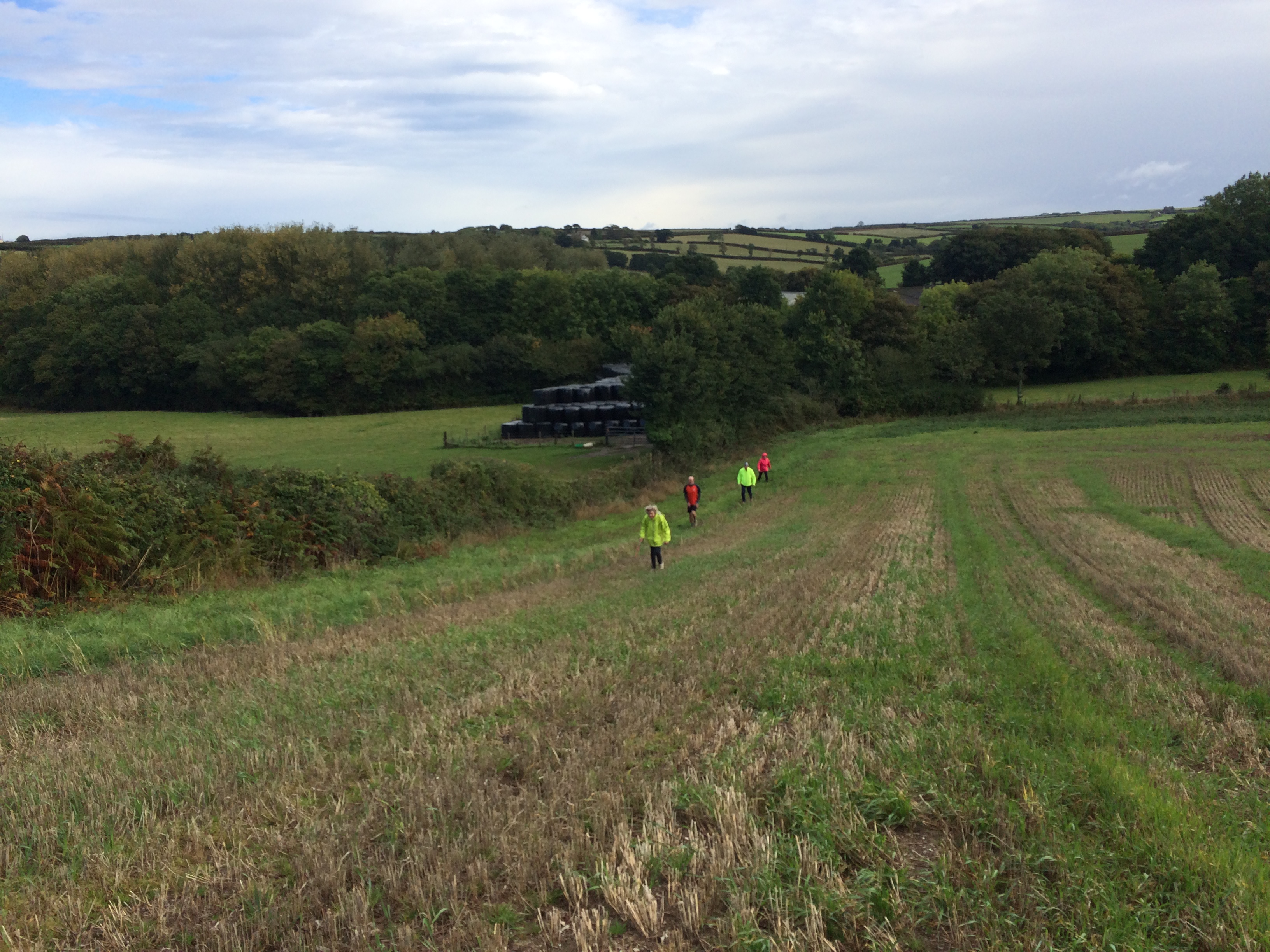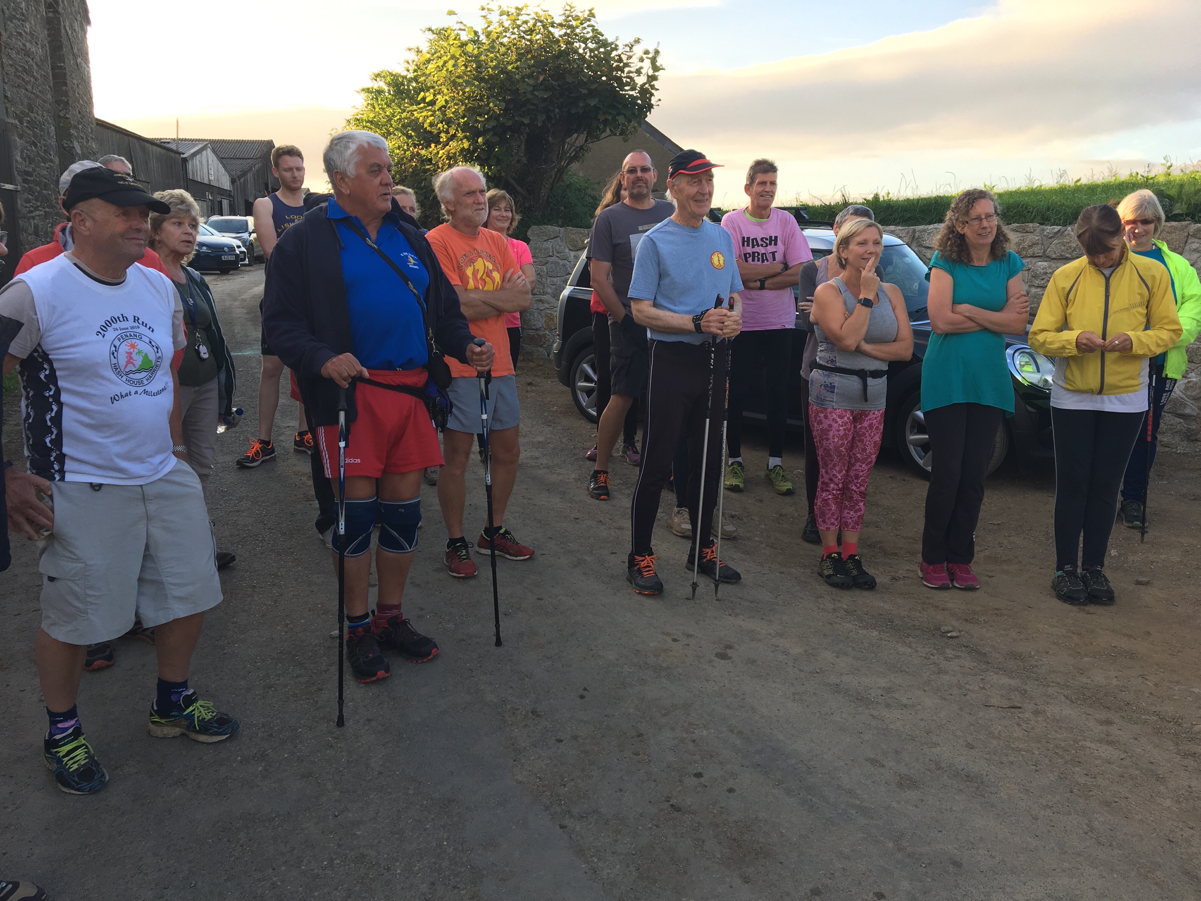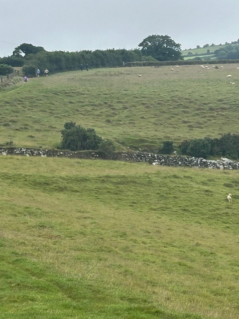 So poor Ted got forgotten again. he really was most put out especially when he heard there was food after too!! Starting at Coldrenick, on another – ‘do I need a jacket or not’ evening, the briefing by The Godmother was short – sawdust, one L/S split, she would lead the longs and Little Bo Peep the shorts. It was good to see some children running – grandkids of hashers down to sunny Cornwall on holiday!!! We started altogether with people checking out all options at the first check. I’m sure we ran on some new territory – was it all part of Coldrenick or perhaps a neighbouring farm? Field after field, road, more fields, most of them having the short stubble left from the hay harvest and some lovely big hay bales. A long short split broke the group up and it was good to see a couple of the younger generation kept on the long. There was a steep climb up one hill which apparently Jon, a friend of Rangi’s tried (unsuccessfully I hasten to add) to chase me and beat me to the top! I only found this out after but it gave Rangi a laugh!! At the top of said hill, we were into long grass and drops very closely laid together. Looking around I realised we were on a hill fort (Padderbury Top according to the OS map), down a road and back into fields – some of us getting a bit cheeky by just running to the field gates to see which one had a check! The Godmother was a bit worried about the time and helped us negotiate a couple of fields before heading steeply down to the bottom of a valley and having a bit of a rambo section, over a fence, across some boggy area and back up the other side, into a field, where we recognised an outbuilding and just ran back to Coldrenick. A great hash with lots of variety – thank you hares.