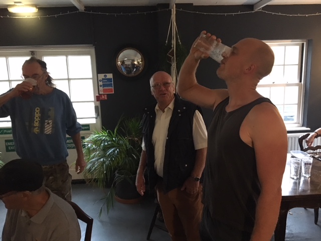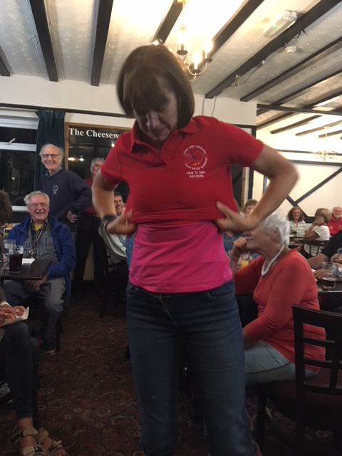 Sadly due to work commitments, Biscuits couldn’t make the run. Godmother delivered the briefing and single handedly managed to hare the longs shorts and walkers. An excellent run across fields and woodland in glorious sunshine. Longs shorts and walkers arrived back at the cars together for a dash through the lanes for the on down at The Sportsman’s. Down downs for Godmother. Also for Mystic Meg for not reading the website last week and navigating to the wrong start point. To Spin The Wheel for falling and to Raffle for laughing at her. Liam was named Mandrake after his loud voice (one for Harry Potter fans). Can everyone have a look in their cupboards and drawers for any of the missing hash prat T shirts.