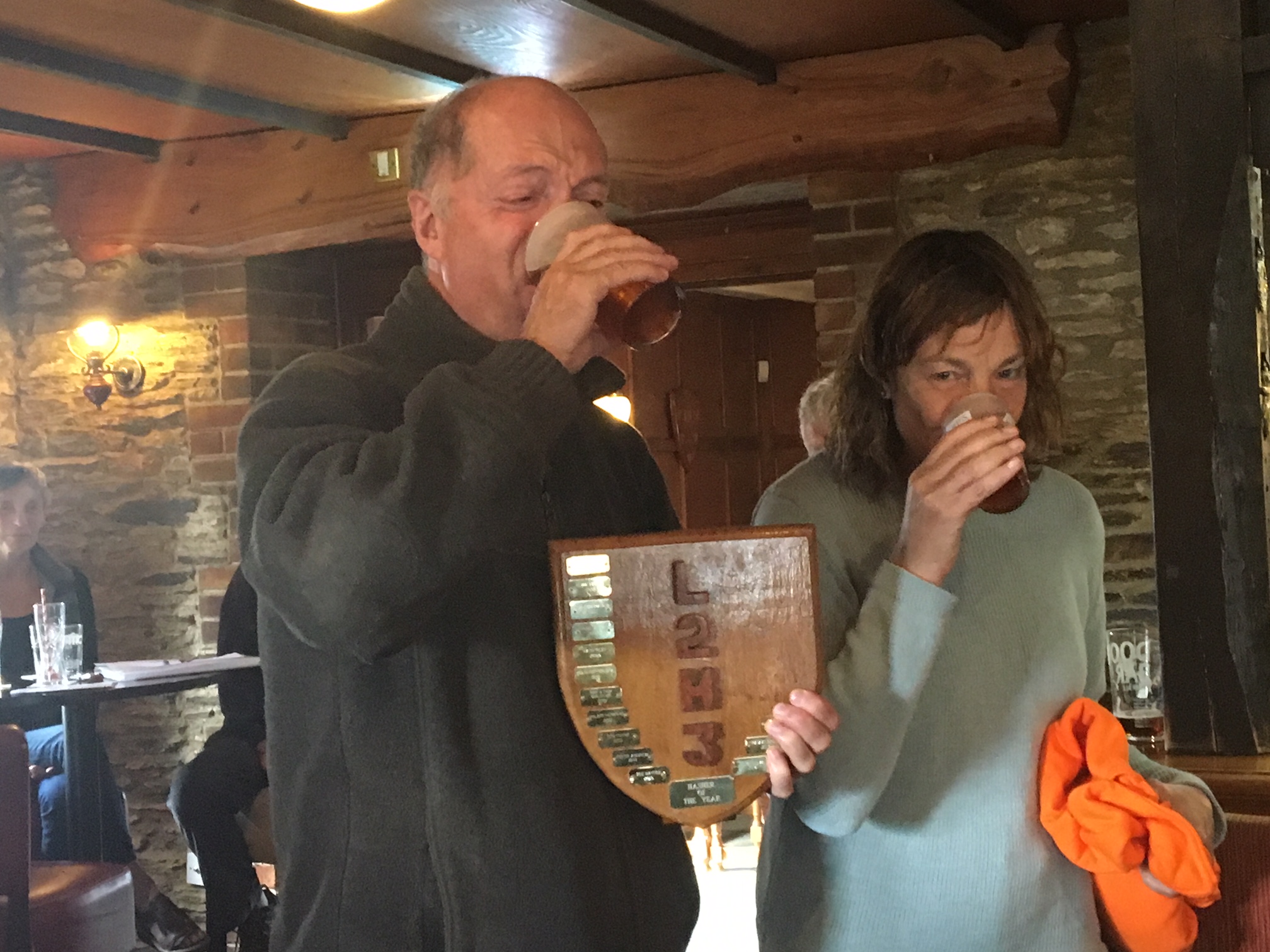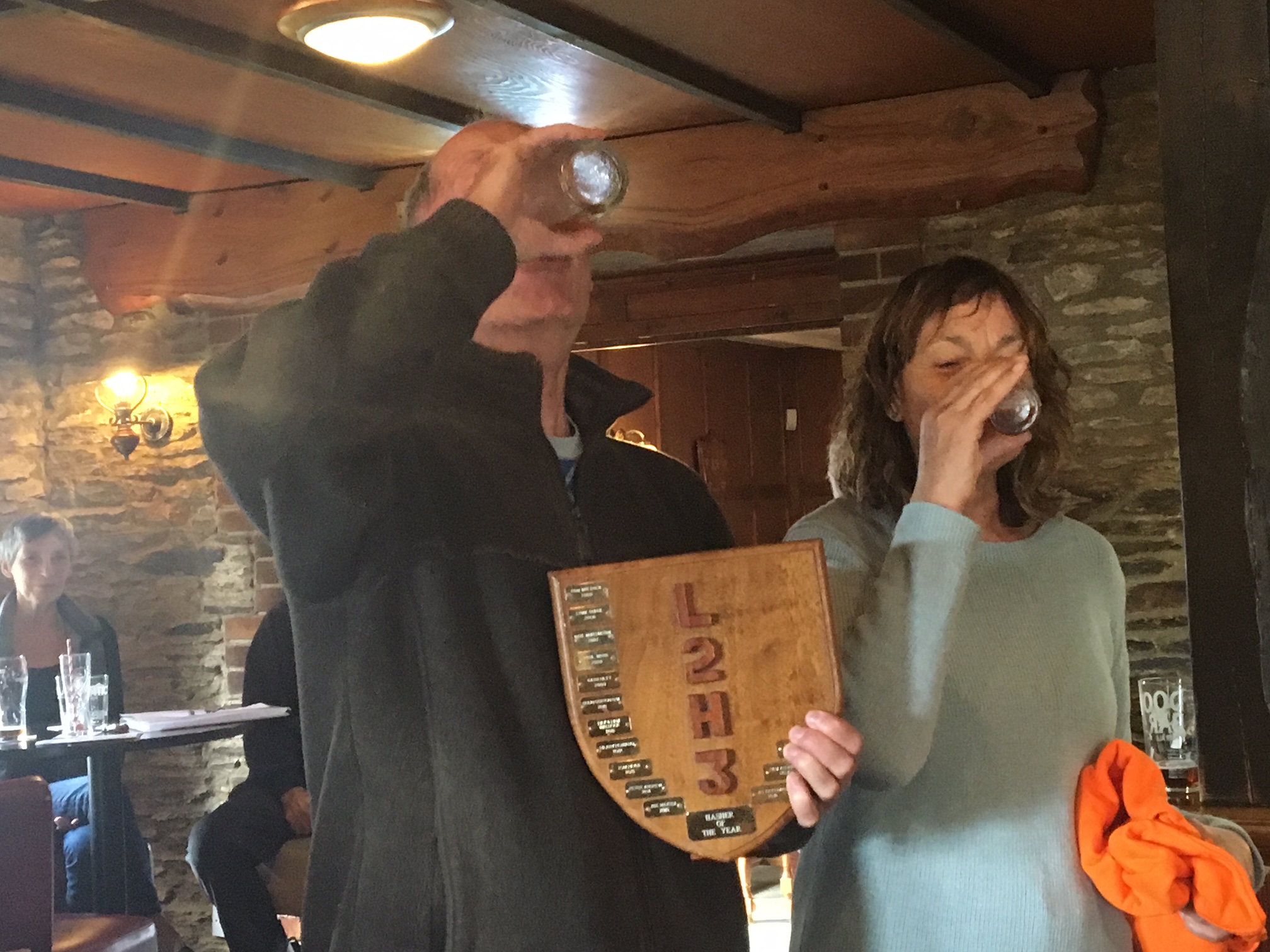 Lesson one, pay attention and take notes. Thanks to Hide ‘n Seek for filling in the gaps. AGM run from Bottonnett Farm After what seems like weeks of gloomy weather we gathered in glorious sunshine for a lovely run with fantastic views. We were supplied with a treasure stop and beer stop along the way. After the run we made our way back to the Firebrand brewery for a fantastic curry and lots of drink. More prizes could also be won from spinning the wheel. Godmother won a very cruel “lay a hash”. A great selection of ales on tap and plenty of nibbles. Down Downs for the hares, Forest, Godmother, Little Bo Peep and Hide ‘n Seek. Also for visiting hasher (Shut That Door!), birthday for Bronyon 21 again and Ketchup Kisses. On Sec deviated from the one minute rule roundup by delivering the roundup of her year in humerous verse. Hope this doesn’t set a precedent. Next year will be back to 60 seconds or less. This year’s awards were given to Eric Big Axe for too much tarmac ( Pensilva run). Hare of the dog to Little Bo Peep for her consumption of too much Langavulin at hash camp. Hasher of the year to a well deserved Er Indoors working behind the scenes to keep the Hash well fed. Hare of the year to Capt’n Oates and Gasbag for their hospitality and generosity. Young Hasher of the year went to Fynn. Thanks to Forest and outgoing Mismanagement for a great day and a wonderful year of Hashing.