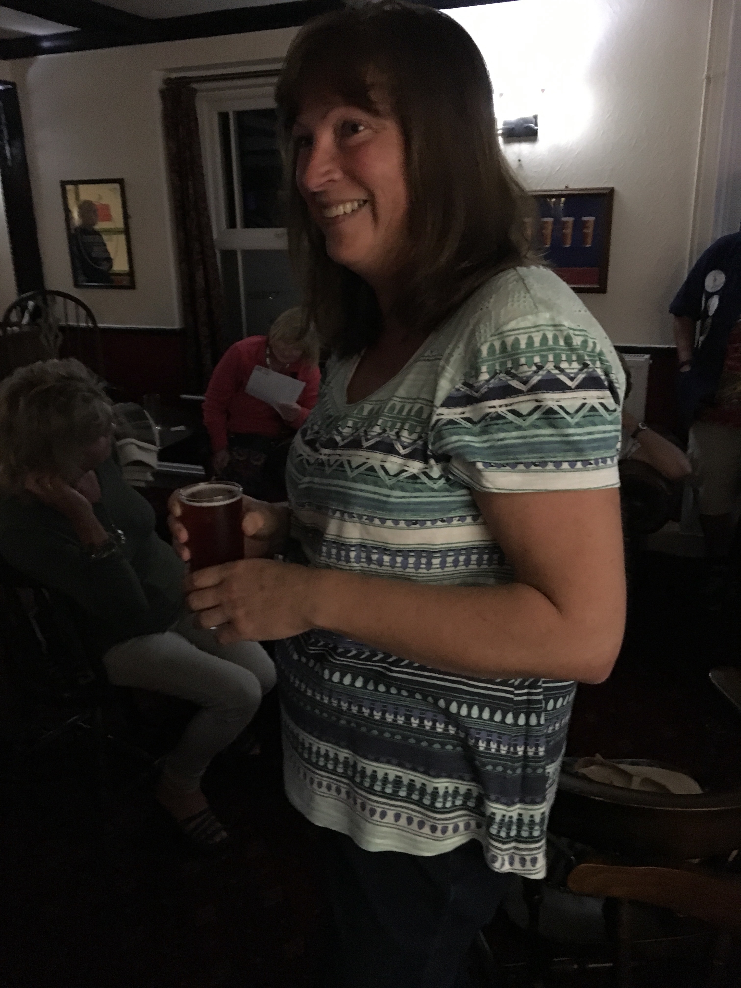 Therefore, with a smile on our face we set off, some, with head torches in hand (just in case). The start was JUST tarmac and at one point I really thought, with the AGM getting closer, that B&M was after the Too Much Tarmac Award!! However, we eventually turned off the road onto a series of footpaths that took us down, down and down! The checks had been tampered with – B&M said it was horses – others were a little more cynical – but with the hare’s help we found the right route. Once through a gate the sawdust was much clearer so we were left to search for ourselves. Of course, what comes down, must come up – a little more tarmac and then back to footpaths, granite styles, woodland, lanes, paths through people’s gardens. The hares had found an amazing multitude of ways of getting us from A-B. It was like going back in time – you could just imagine the locals walking these routes before the invention of motor vehicles. Just before we hit the main road back into the village there was a long/short split. I assume the longs headed for home but the longs turned left and went down down down again through a woodland area following a beautiful stream. There were then more of the above – stunning pathways, gates through people’s lands and granite styles, finally coming out on a path by the church. A truly stunning hash (despite the ups and downs) and it stayed dry!! Thanks to all the hares. Down downs at the pub for the hares – B&M, Spin the Wheel, Your Nicked (although she gave hers to the raffle) and Ada (who was having her own down down from her Mum!!) Also a down down to Forest for 600 runs (only taken her 33 years to get there) and of course to the newly weds – Mystic Meg and Falsie – with a little bit of confetti thrown onto their heads and a card and bottle from the hash. A great evening in a scenic spot.
